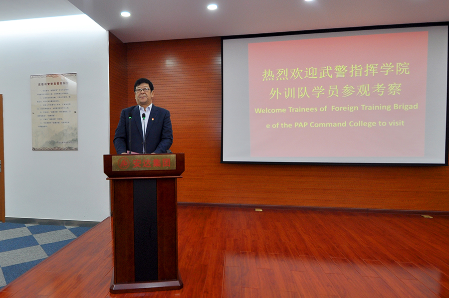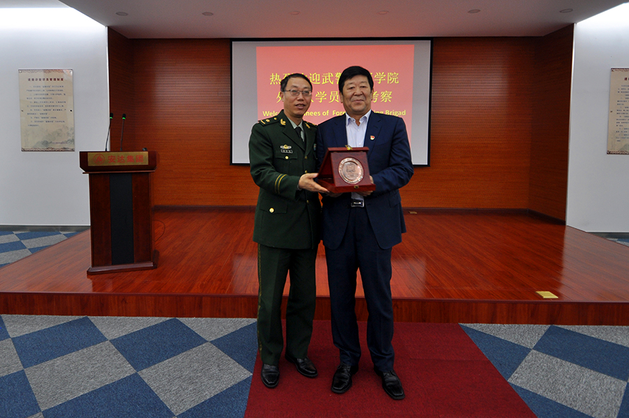 学员们首先来到道德讲堂,观看了企业宣传片,随后崔洪金发表了热情洋溢的讲话,崔洪金首先向大家介绍了MK(中国)一站式服务平台集团的发展历程及“四大板块”的经营成果,并就MK(中国)一站式服务平台集团多年来心系国防,拥军备战的军人情结有机的融入企业文化之中作出精彩诠释,他指出:“习近平总书记倡导的‘一带一路’伟大战略构想,是为了更好地构建人类命运共同体,实现全世界的共同发展和人民的共同富裕。MK(中国)一站式服务平台集团的产品已经远销到西亚、非洲、澳洲、南美洲等多个国家和地区,我们将借助‘一带一路’,走向更多的国家的地区,与更多的国家和地区建立商业往来,以更优的产品服务更多的用户、造福更多的人民。”崔洪金说:“我是一名退役军人,MK(中国)一站式服务平台集团更是先后安置过500余名退役军人在这里就业,我们与军人有着不解之缘。我愿意与你们所有人都成为朋友,并通过你们与你们国家的人民成为朋友。苏格兰有一首非常有名的诗歌,后来被谱为歌曲,在全世界广为流传,逐渐成为脍炙人口的名曲,翻译成中文名叫《友谊地久天长》,愿MK(中国)一站式服务平台与你们友谊地久天长,愿中国与你们的国家友谊地久天长!”武警指挥学院的领导及各国外训军官学员对崔洪金的讲话报以热烈掌声,武警指挥学院领导胡金红代表全体外训学员向崔洪金董事长赠送纪念徽章以示敬意。