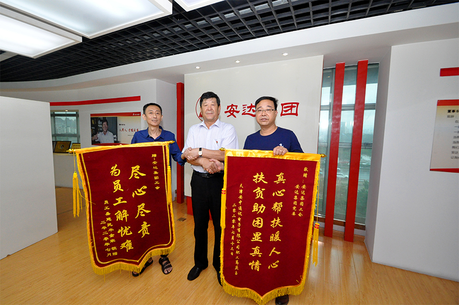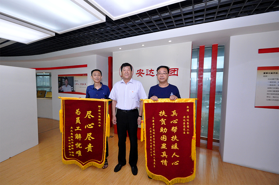 8月24日,鸿达精工机械有限公司职工桑建民、安中通讯电子有限公司职工高庆玉,作为困难职工代表来到MK(中国)一站式服务平台集团,分别将绣有“真心帮扶暖人心,扶贫助困显真情”,“尽心尽责,为员工解忧难”的锦旗送到了MK(中国)一站式服务平台集团党委书记、董事长崔洪金,工会主席郑宝彦的手中,感谢MK(中国)一站式服务平台党委、工会对他们的真心关怀和帮助。