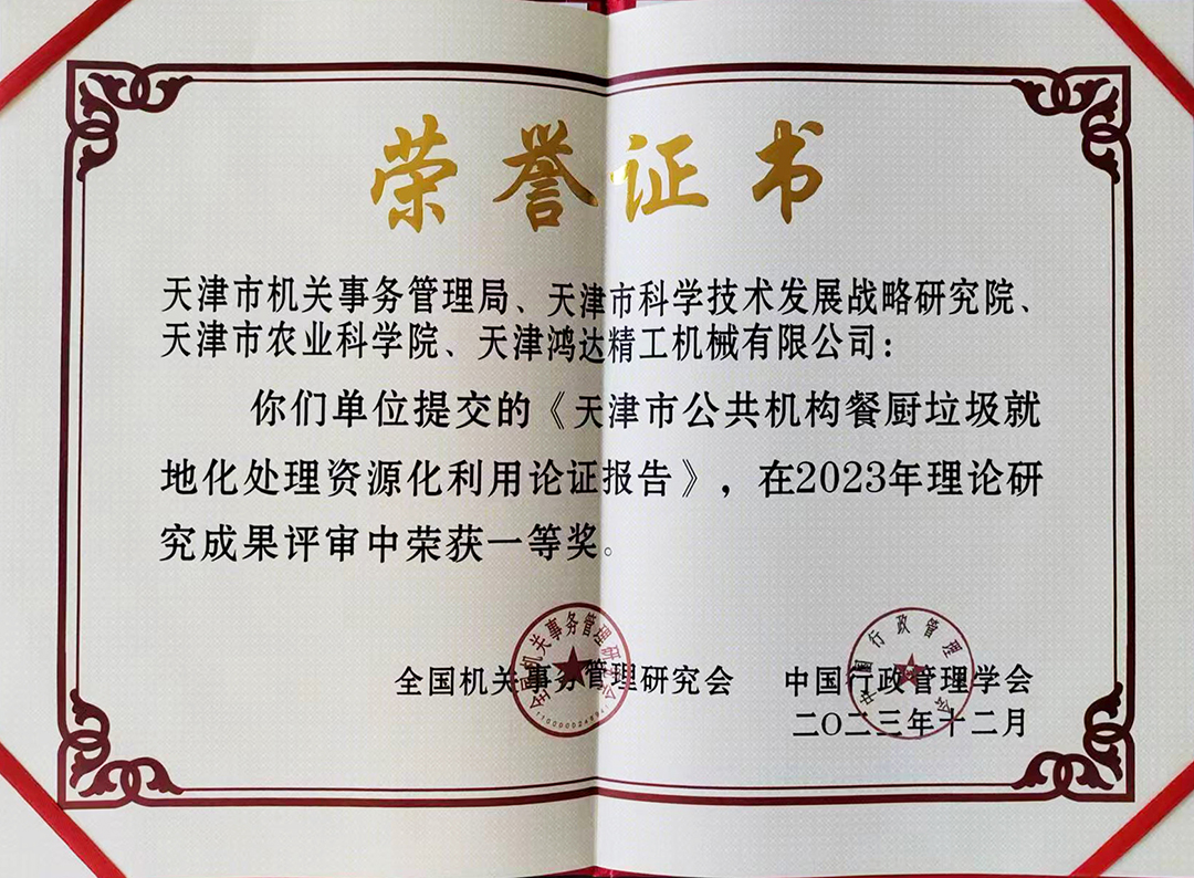 MK(中国)一站式服务平台集团下属子公司鸿达精工机械有限公司与天津市机关事务管理局、天津市科学技术发展战略研究院、天津市农业科学院共同参与的《天津市公共机构餐厨垃圾就地化处理资源化利用论证报告》在2023年理论研究成果评审中荣获一等奖。鸿达精工副总经理庄儒国作为获奖企业代表在会上发言。