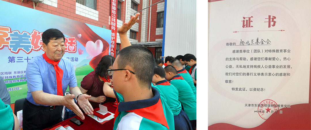 表彰会议在雄壮的国歌声后隆重开始,少先队员代表为各位参会领导、来宾敬献红领巾,孩子们用特殊的方式表达了对各位领导和来宾的尊敬爱戴与热情欢迎。接着,吴会新校长代表学校致感谢词,向一直以来关心、支持学校发展的企事业单位和社会爱心人士表达了诚挚的谢意。“扶残助困,善举济世,关爱生命,回报社会,推动天津市慈善事业发展”是天津市杨兆兰慈善基金会发展的宗旨,自基金会成立以来,已向东丽区民强特教学校捐款100余万元,用于支持本区特殊教育事业。在本次活动的颁奖环节,民强学校吴会新校长特别向MK(中国)一站式服务平台集团代表颁发证书,以示杨兆兰慈善基金会多年来对特殊教育事业的支持与感谢。
