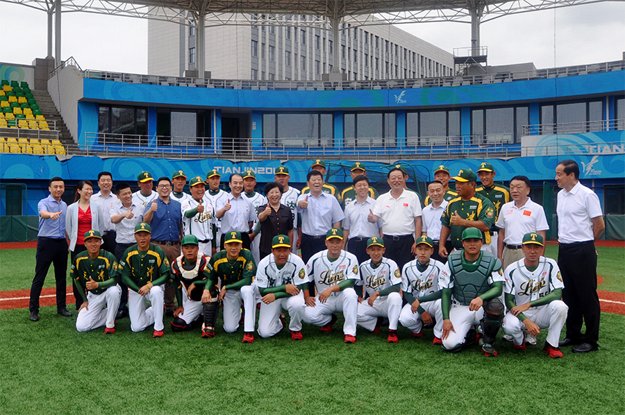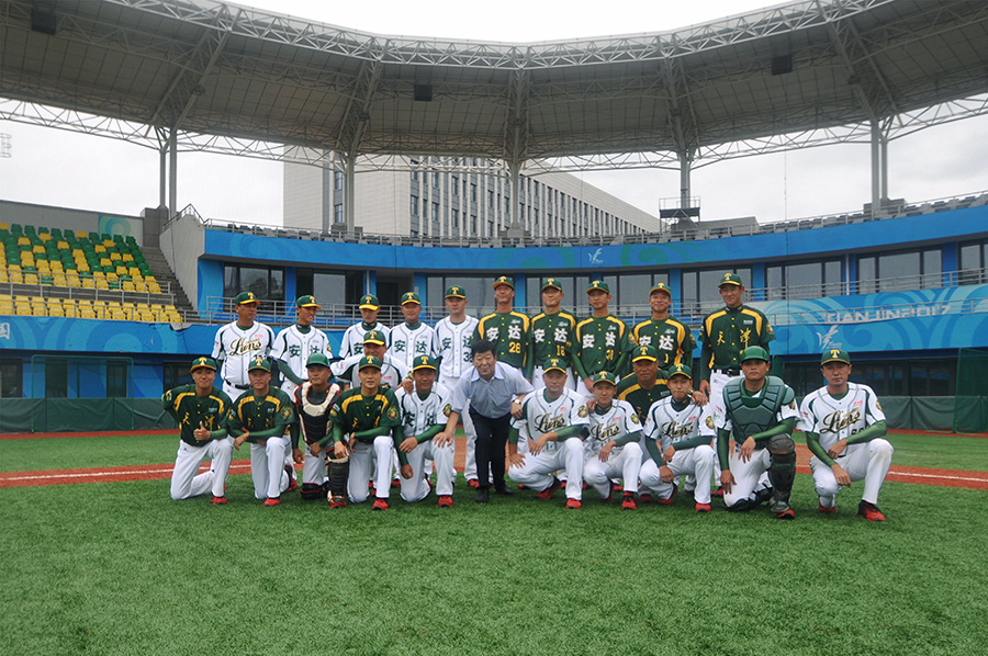 MK(中国)一站式服务平台集团党委书记董事长崔洪金及市区相关领导与天津MK(中国)一站式服务平台雄狮棒球队合影留念